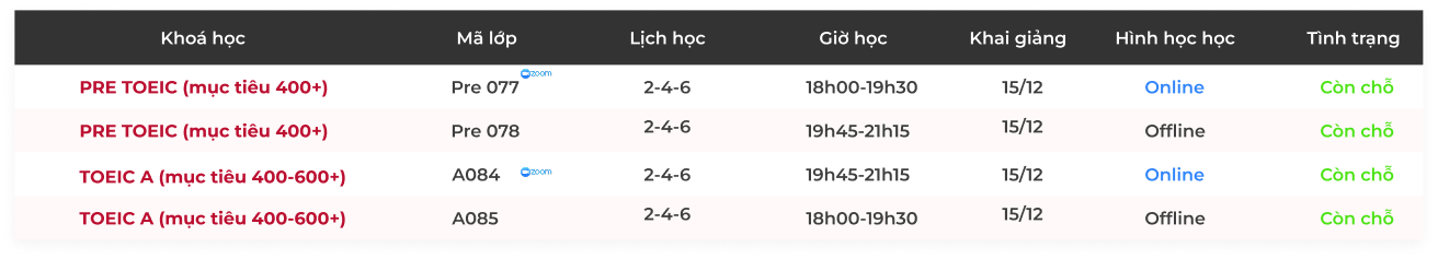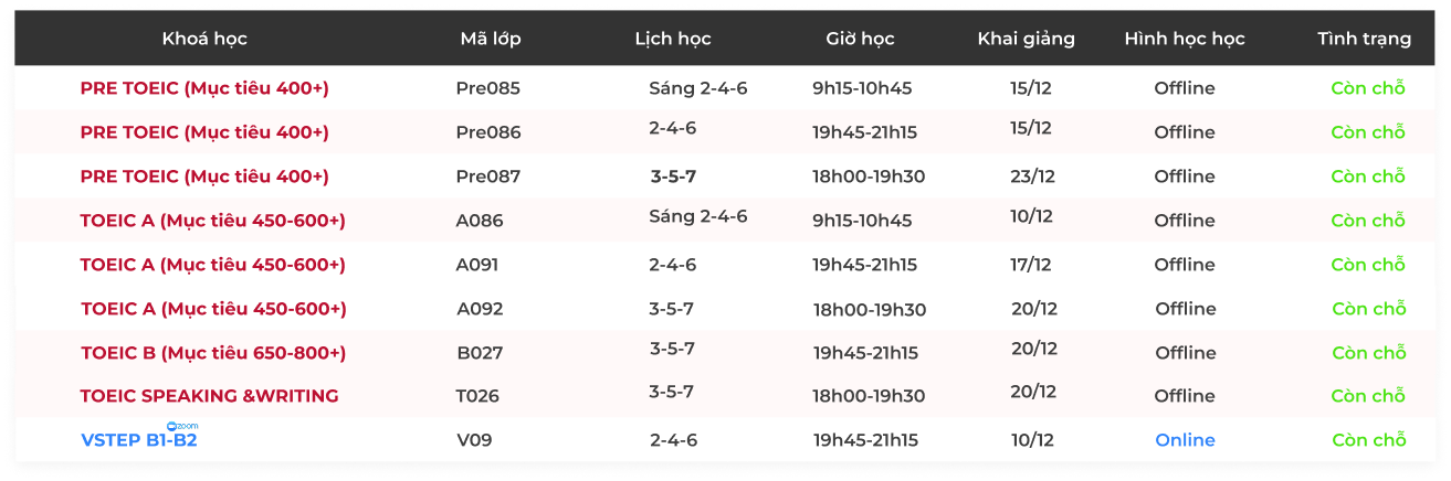 LỊCH KHAI GIẢNG THÁNG 12 & 1